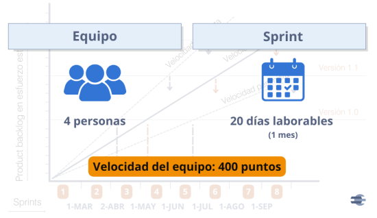 • El equipo está formado por 4 personas y desarrolla una velocidad media de 400 puntos por sprint.