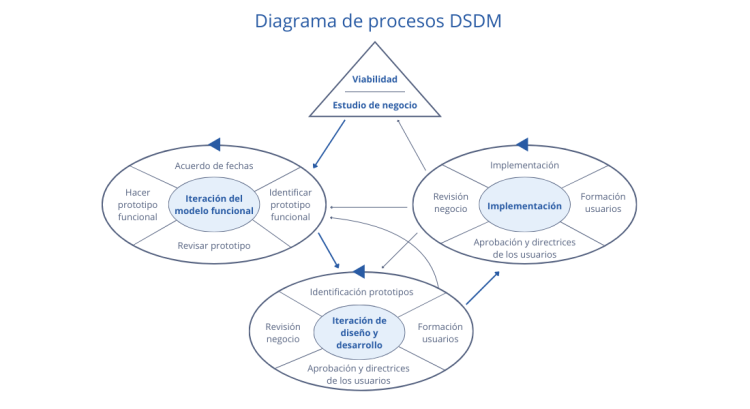 El ciclo de desarrollo de DSDM está compuesto de 5 fases, a las que se les suma un pre-proyecto y un post-proyecto: