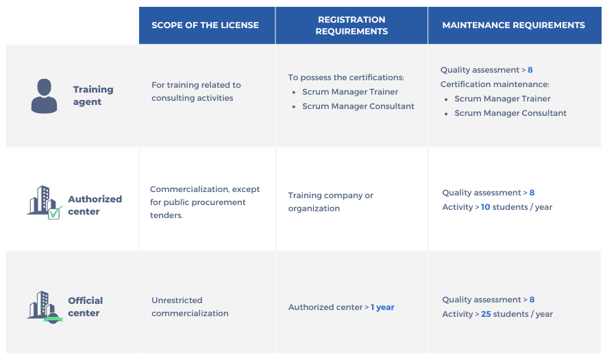 The following table shows the equivalence by content and hours of training between the certifications issued by Scrum Alliance, Scrum Manager and Scrum.org for the professional profiles of Scrum Master, Product Owner and Scrum Developer.