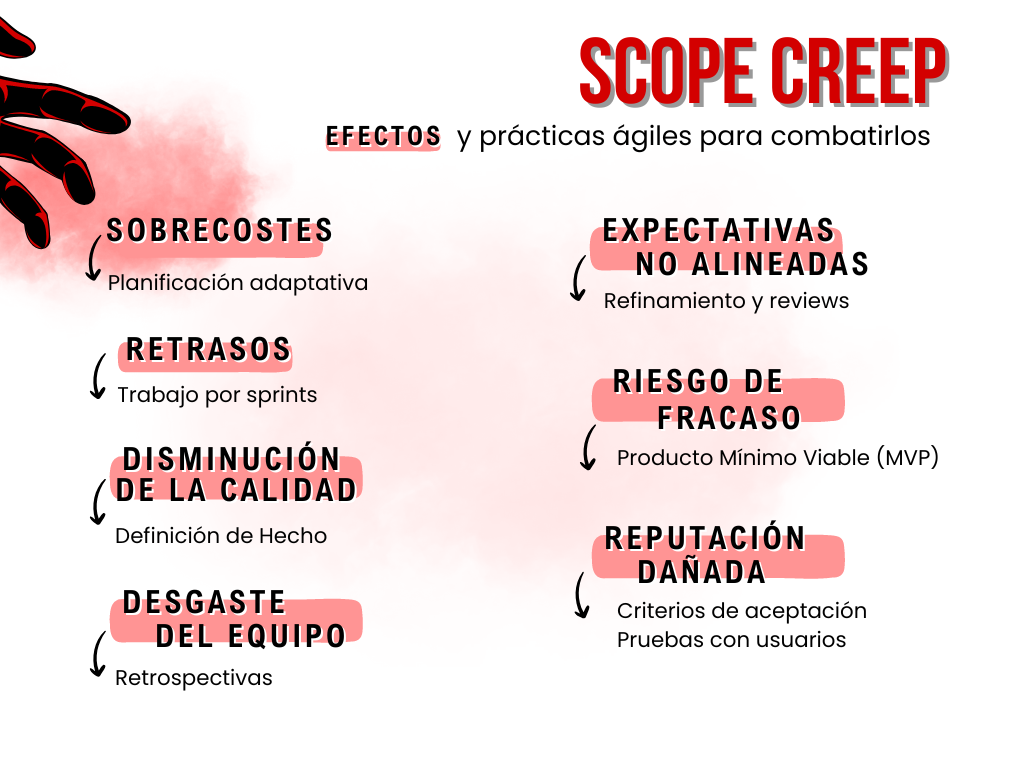 Siendo más concretos, vamos a analizar algunos de los efectos adversos más comunes del Scope Creep y qué prácticas ágiles pueden ayudar a mitigarlos: