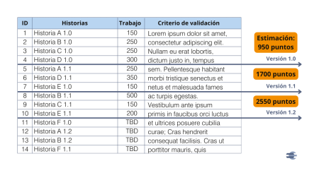 En este caso, el propietario del producto tiene previsto lanzar la versión 1.0 cuando disponga de las cuatro primeras historias, que tienen un esfuerzo estimado de 950 puntos (150+250+250+300).